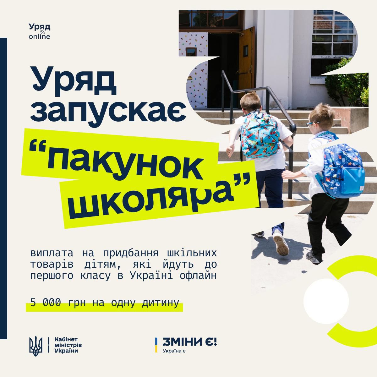 “Цю допомогу можна буде витратити на придбання необхідного канцелярського приладдя, книжок, дитячого одягу та взуття для тих, хто відправляє свою дитину в перший клас в офлайн форматі”, – зазначив Прем’єр-міністр Денис Шмигаль.