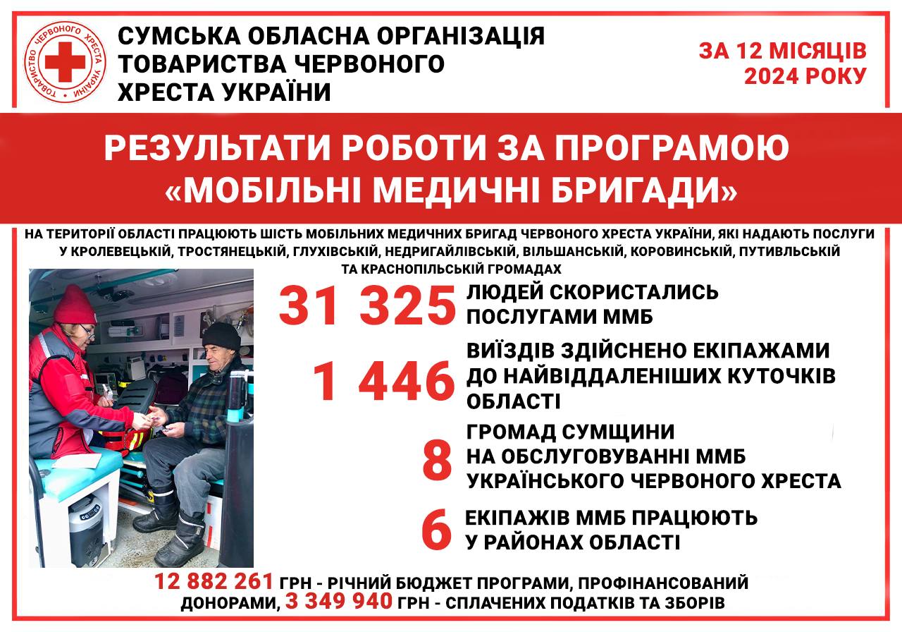 Протягом 2024 року мобільні медичні бригади (ММБ) Сумської обласної організації Товариства Червоного Хреста України здійснили майже 1 500 виїздів, медичними послугами скористалися 31 325 людей у 8-ми ми громадах Сумської області.